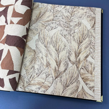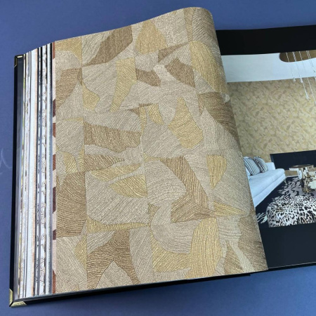 Второй сет - это оригинальные изгибы дамаска, скомбинированные с полотнами, имитирующими шкуры животных, и небрежной эстетикой имитации штукатурки. Однотонные полотна с объемными кракелюрами позволят разнообразить дизайн и визуально сегментировать пространство.
