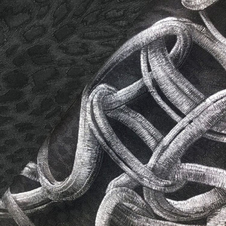 На этот раз рисунок, ставший символом, вернулся в метровой ширине, сплетясь воедино с геометрической композицией, словно летящей над основным фоном. Такой эффект стал возможен благодаря уникальной технике, примененной для обтачивания геометрического рисунка.